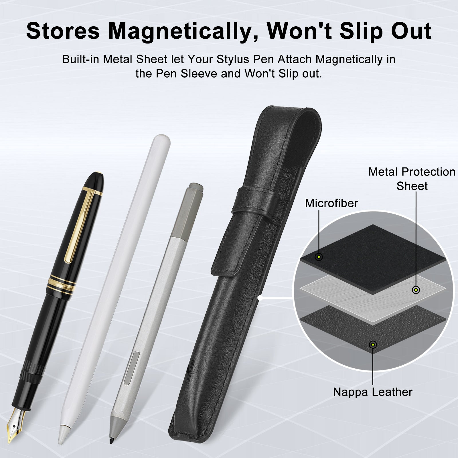 • Stylus Friendly, Stores Magnetically, Won't Slip Out: RENAISSER pen case has a metal sheet layer, it can attach Apple Pencil, Surface Pen, or others stylus which have built-in magnets.