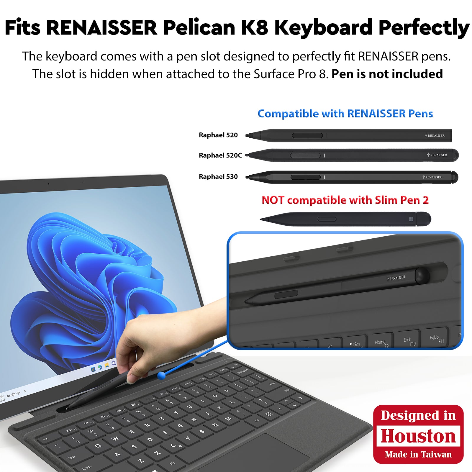 - Pen slot for RENAISSER Pens: Comes with a pen slot that can store the RENAISSER Stylus, like Raphael 520/520C/530. The slot is hidden when the keyboard is attached to the Surface Pro 9/8/X. It is just like the original signature keyboard from Microsoft. Now you can carry the Surface Pro 9/8/X with a keyboard and stylus both made by the top quality RENAISSER brand. *Please note the slot doesn't fit Slim Pen, Slim Pen 2, and may not fit other non-RENAISSER stylus. *Pen is not included.