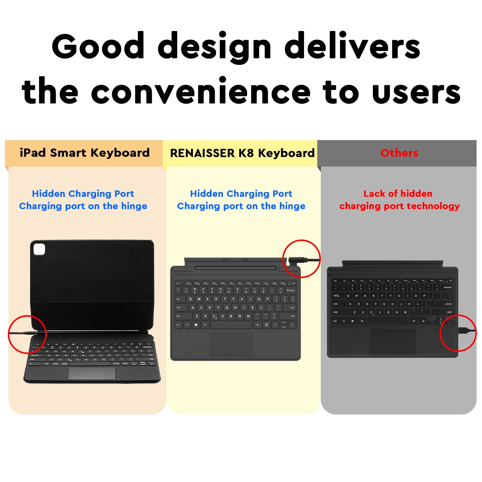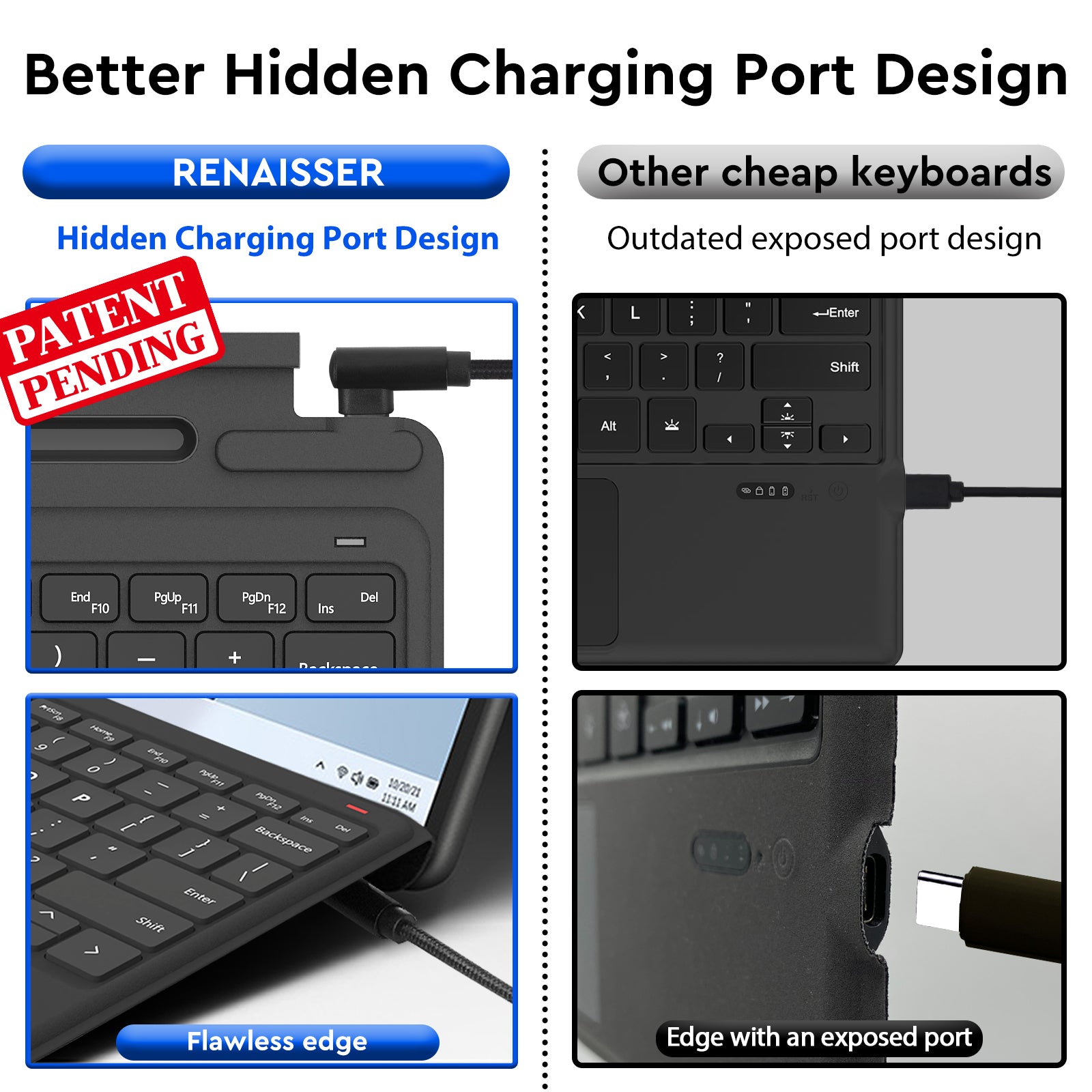 - Patent Pending First Hidden Charging Port Design for Surface Pro Series: RENAISSER put the charging port in the top corner, the port is hidden when the keyboard attaches to the Surface Pro 9/8/X. Unlike other cheap keyboards which have an exposed charging port on the side. The RENAISSER Pelican K8 Keyboard was designed to be a class above the rest. The patent of hidden charging port of Renaisser covers the different kinds of bluetooth keyboards.
