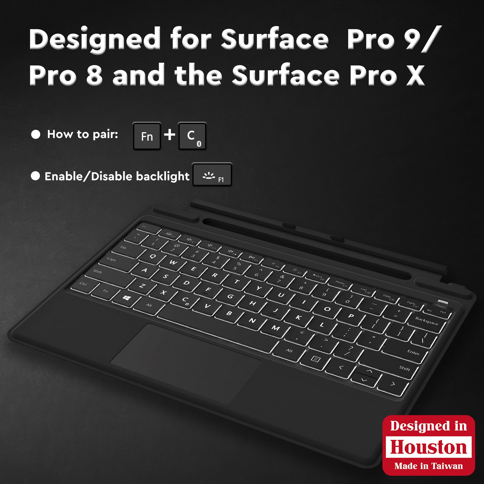 - Compatible with Surface Pro 9, Surface Pro 8 and X: The RENAISSER Pelican Keyboard is compatible with Surface Pro 9/8/X, it will attach to the Surface Pro 8/X magnetically. The Keyboard connects via Bluetooth and allows you to use the keyboard and touchpad with the keyboard detached from the Surface Pro 9/8/X. (To pair the keyboard, please press Fn + C) (*NOTE - The keyboard does not fit others Surface models).