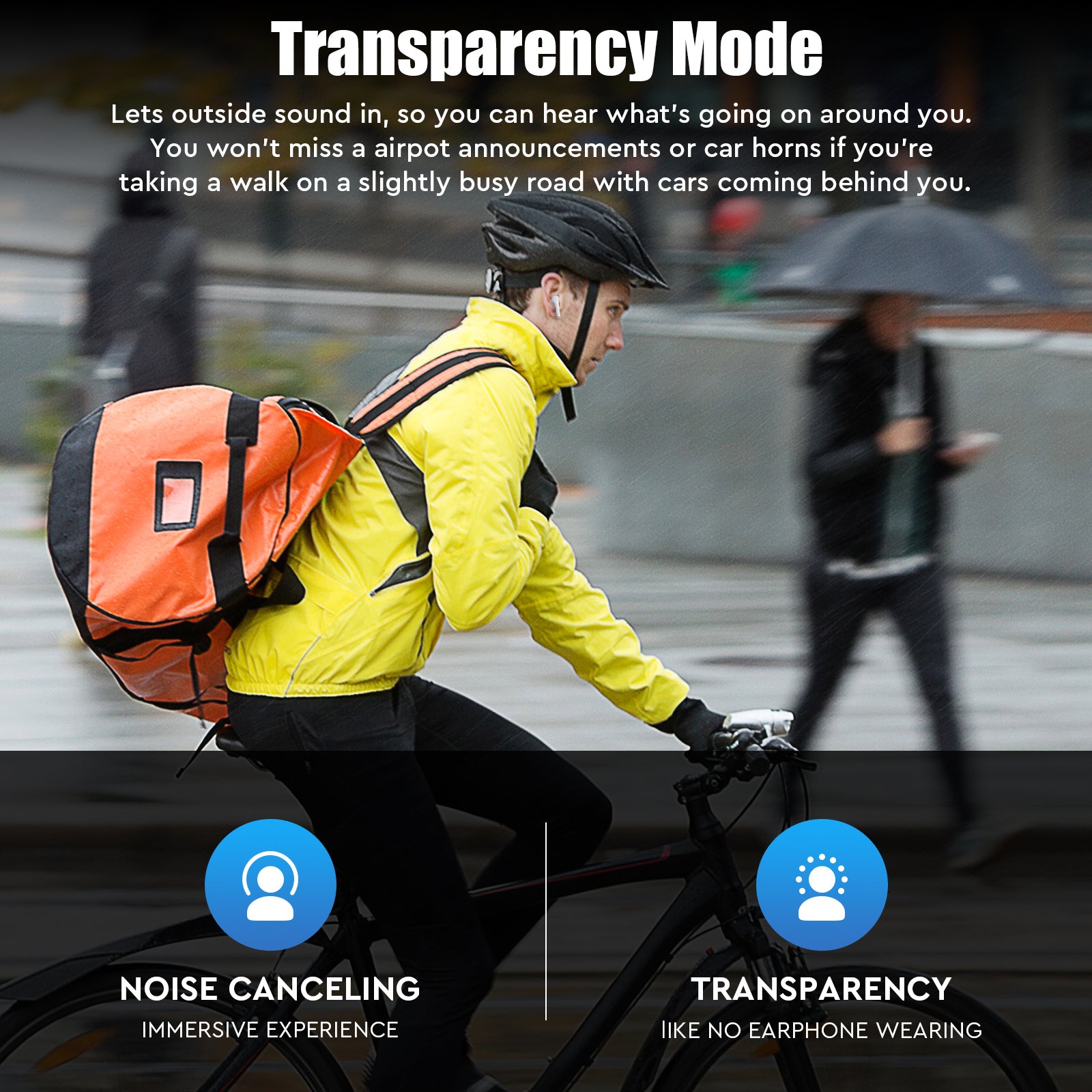 - 【Transparency Mode】 Lets outside sound in, so you can hear what's going on around you. You won't miss an airport announcements or car horns if you're taking a walk on a slightly busy road with cars coming behind you without taking off the headphones.