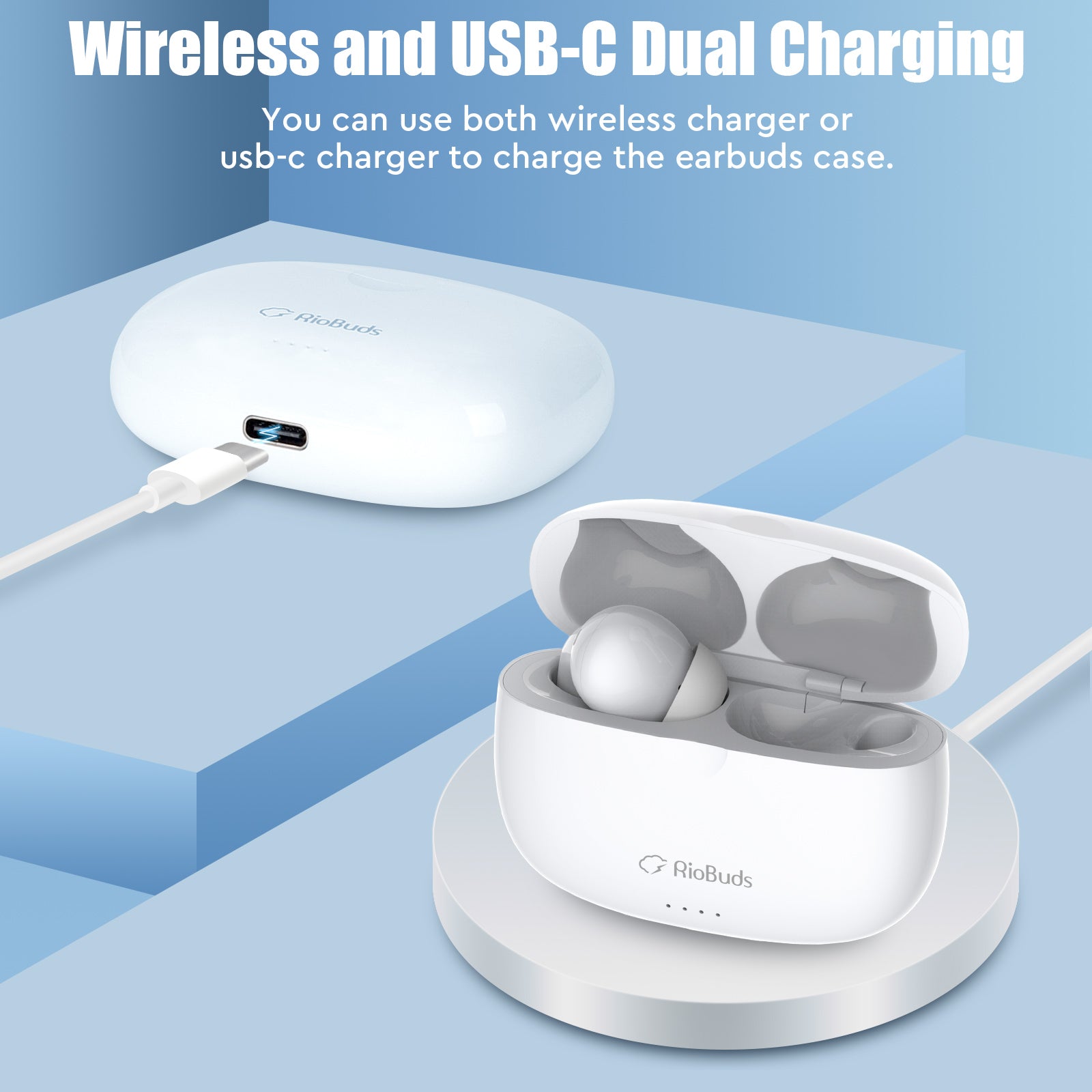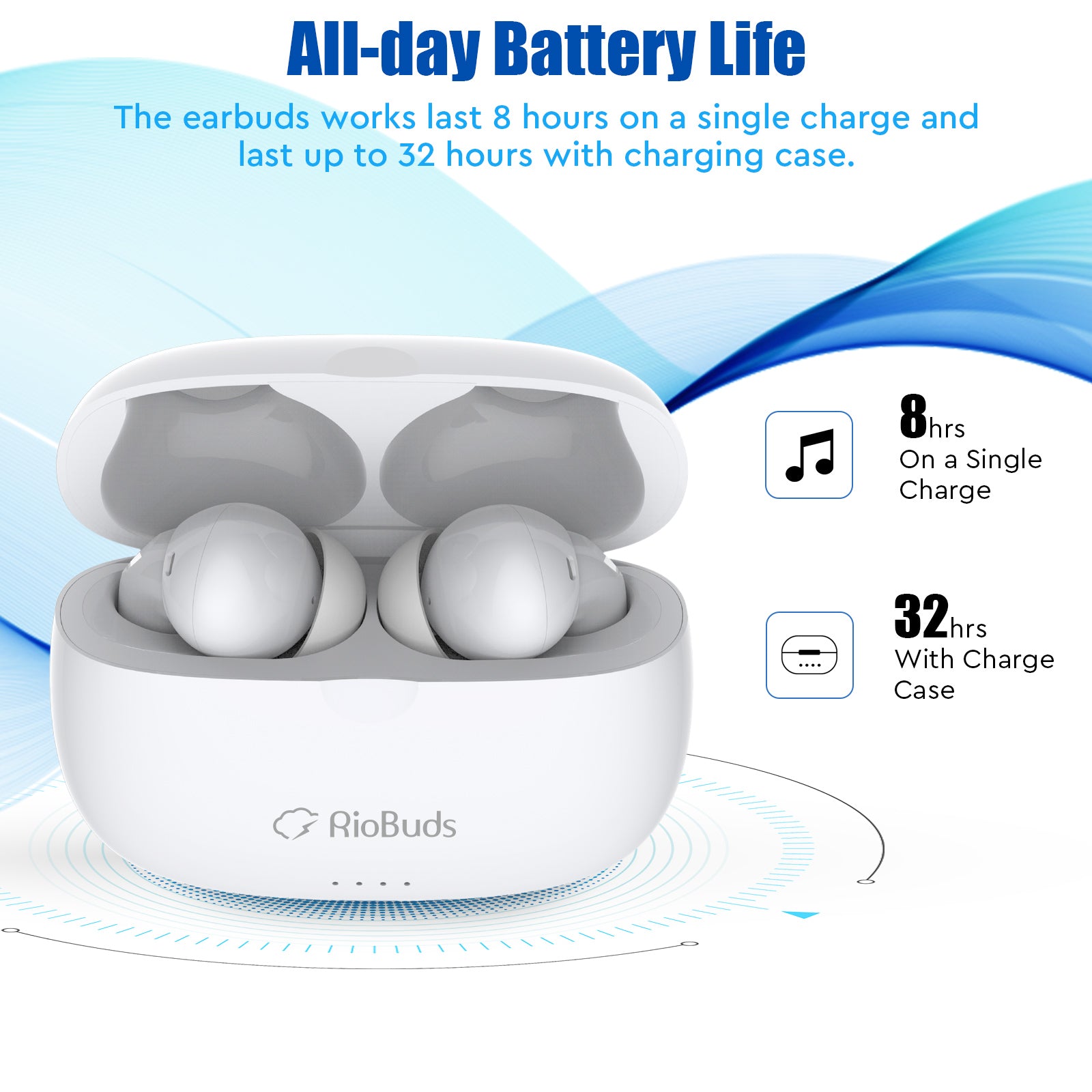 - 【All-Day Battery Life】RioBuds wireless earbuds can last for over 8 hours' playtime from a single charge and 32 extra hours in the compact charging case to ensure your daily use. Equipped with Type-C charging port for your convenience with wide applicability. The LEDs on the charging case tells you clearly the power left.