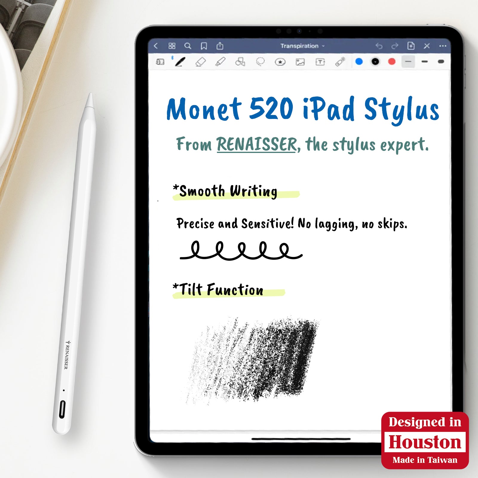 - Latest RENAISSER Stylus Technology & Magnetic Design: RENAISSER Monet 520 iPad Stylus features palm rejection and tilt drawing function, you can rest your hand naturally on the screen when writing and the iPad won't register any marks. Tilt function allows the artists to shade just like a real pencil when the stylus is tilted at an angle. Magnetic design allows you to attach Monet 520 to the iPad.