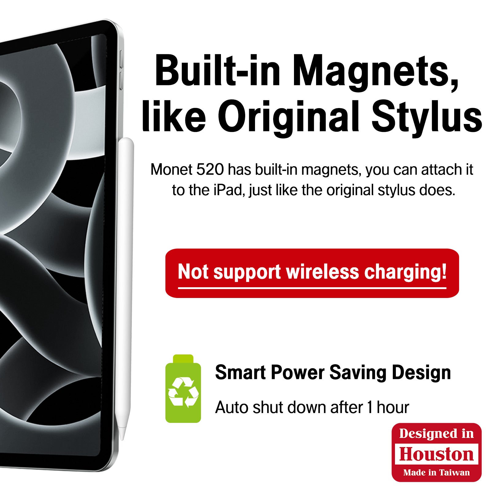 - Built-in Magnets, like the original Stylus: Monet 520 have built-in magnets, that firmly attach to your iPad at any time. You can attach it to the iPad, just like the original stylus does. Your pen won't fall on the floor or get lost on the messy table anymore.
