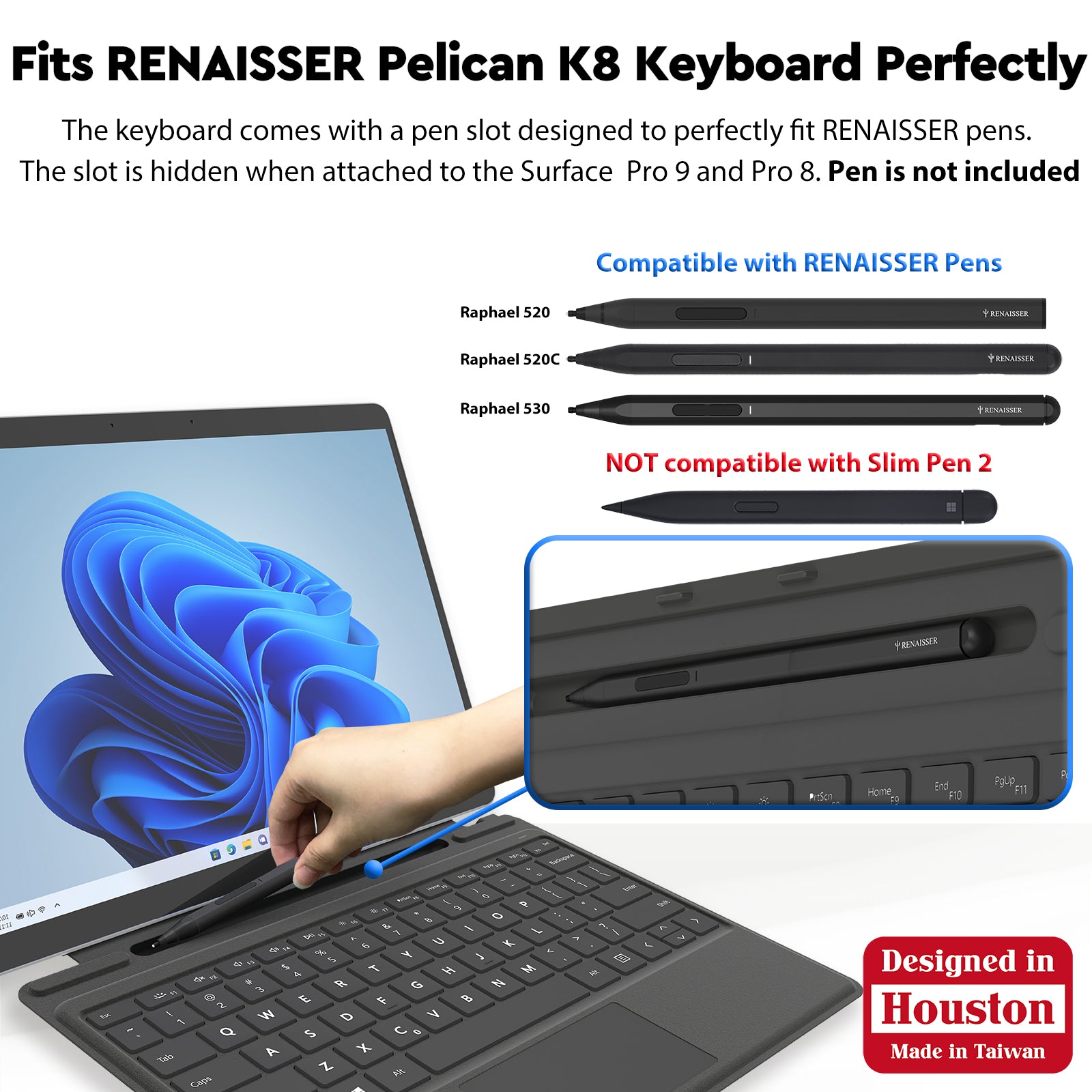 - Pen slot for RENAISSER Pens: Comes with a pen slot that can store the RENAISSER Stylus, like Raphael 520/520C/530. The slot is hidden when the keyboard is attached to the Surface Pro 9/8/X. It is just like the original signature keyboard from Microsoft. Now you can carry the Surface Pro 9/8/X with a keyboard and stylus both made by the top quality RENAISSER brand. *Please note the slot doesn't fit Slim Pen, Slim Pen 2, and may not fit other non-RENAISSER stylus. *Pen is not included.