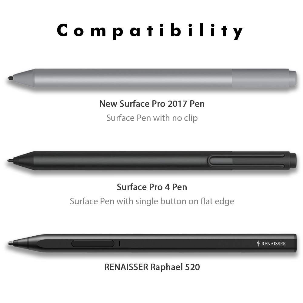 - Compatible with Surface Pro 2017 Pen (Model 1776), Surface Pro 4 Pen and RENAISSER Raphael 520/520C/530/Raphael 520BT, not compatible with other models.