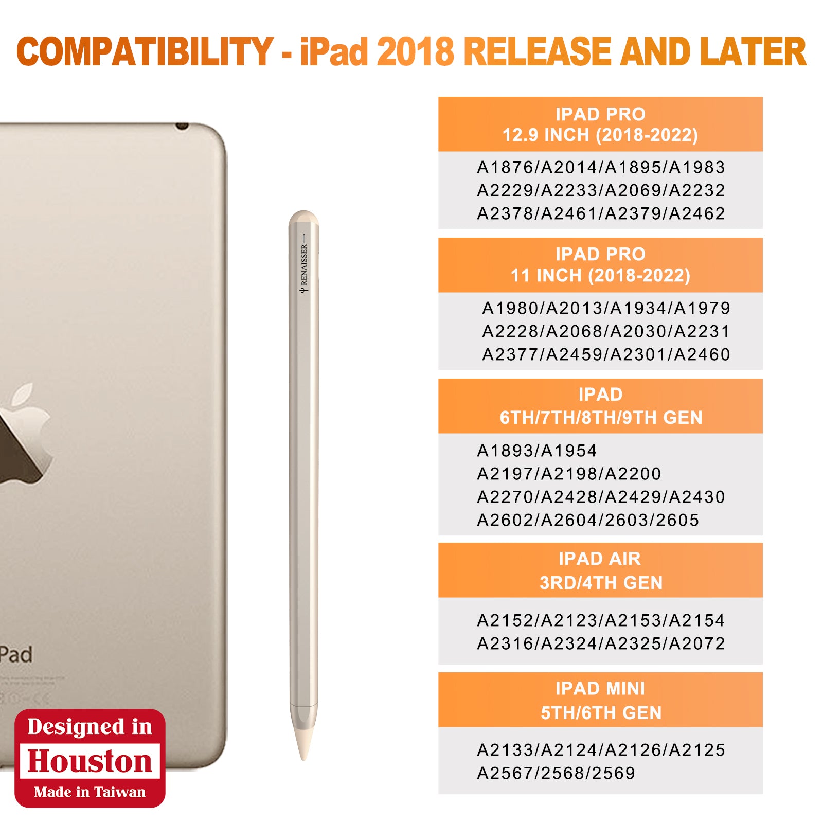 - Compatible with iPad 2018-2022 - RENAISSER Turing 520 supports these iPad models: 9th/8th/7th/6th Gen, iPad Air 3rd/4th/5th Gen, iPad Pro 11/12.9 inches 3rd/4th/5th, iPad Mini 5th/6th Gen. Please check your device model before placing an order, this pen is for listed models only, other models are not compatible.