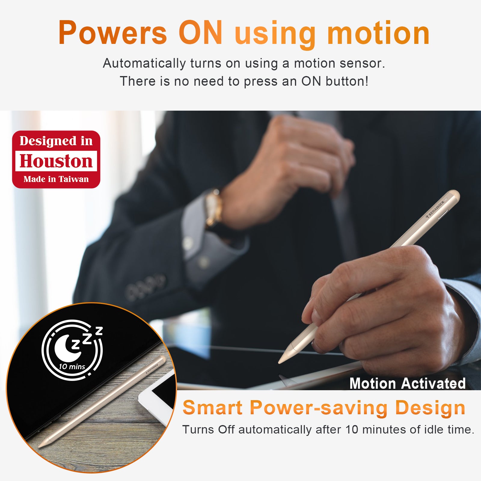 - Powers ON using motion, Smart power management - Automatically turns on using a motion sensor. No need to press an ON button! More importantly, without a power button the pen looks more seamless and fantastic. With the Smart power management design, the pen will turn off automatically after 10 minutes of non use. Just 4 minutes of charging provides enough power for 60 minutes of use. A 20-minutes charge can last for more than 40 hours.