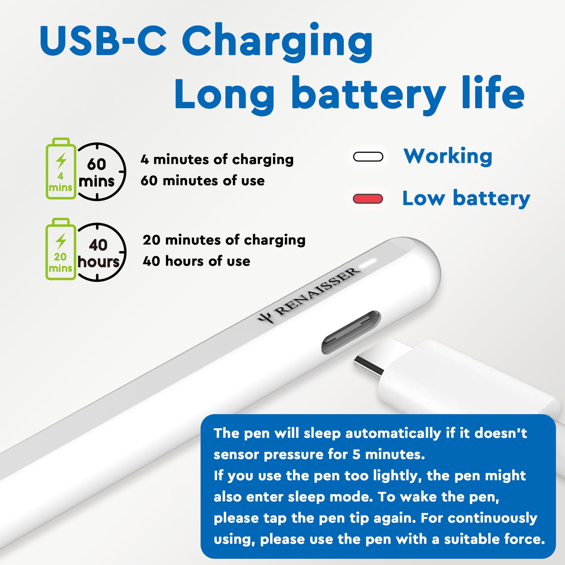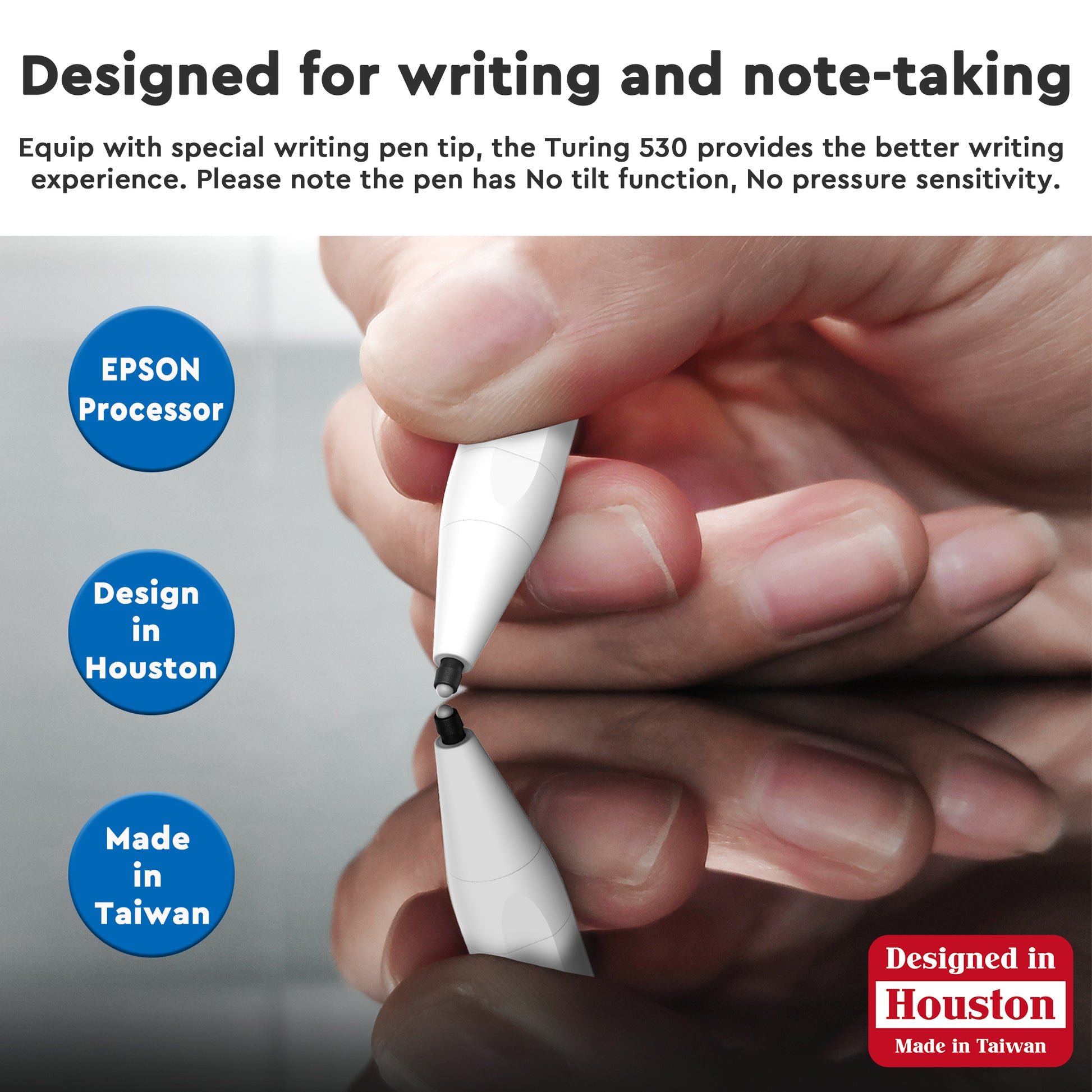 - No need to press an ON button! More importantly, without a power button the pen looks more seamless and fantastic. We care about all the details. RENAISSER Turing 520 was designed in Houston, Texas, it uses a Japanese EPSON processor chip and is made in Taiwan. Built with a Premium quality USB-C connector for safety and reliability. Others use PCBA as the connector, which has a high risk of fire and short circuiting.