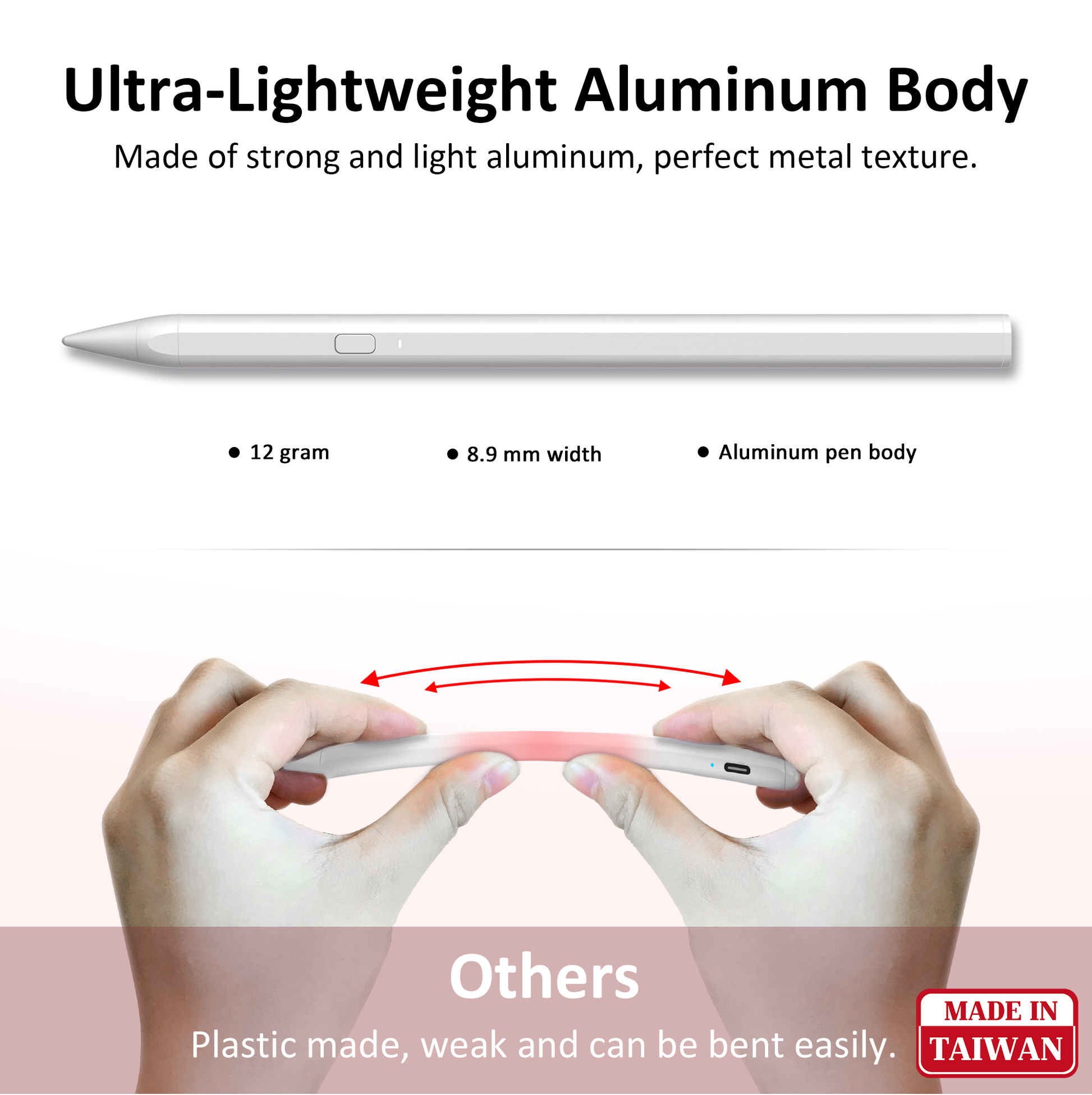 - Ergonomic Design- 8.9mm width is identical to the Apple Pencil, it is comfortable to hold, and the design is beautiful and elegant. It weighs just 12 grams and the weight is balanced perfectly on both ends, a stylus this balanced reduces hand fatigue after extended usage.